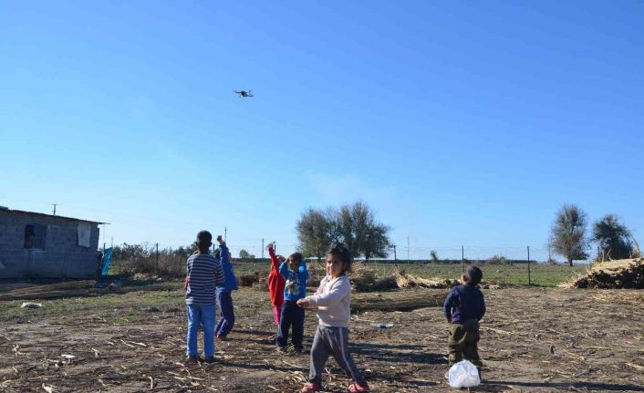Adana’nın Kozan ilçesinde ilk defa drone gören Roman çocukların mutluluğu kameralara yansıdı.