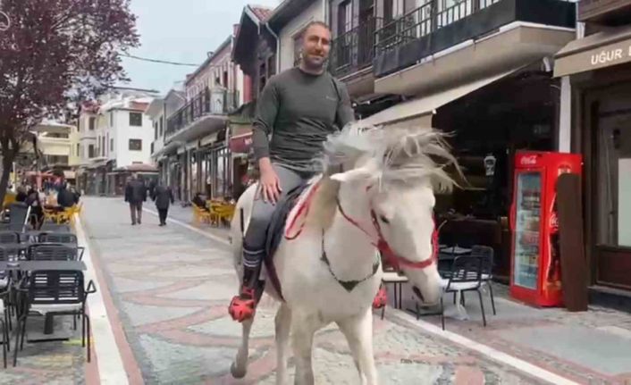 Edirne’de yaya trafiğinin yoğun olduğu Saraçlar Caddesini beyaz atla turlayan bir vatandaş, ilginç görüntü sergiledi.