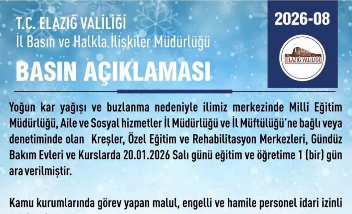 Elazığ Valiliğinden yapılan açıklamada, "Yoğun kar yağışı ve buzlanma nedeniyle ilimiz merkezinde Milli Eğitim Müdürlüğü, Aile ve Sosyal Hizmetler İl Müdürlüğü ve İl Müftülüğü’ne bağlı veya denetiminde olan kreşler, özel eğitim ve rehabilitasyon merkezleri, gündüz bakım evleri ve kurslarda salı günü eğitim ve öğretime 1 gün ara verilmiştir. Kamu kurumlarında görev yapan malul, engelli ve hamile personel idari izinli sayılacaktır. Anne ve babası çalışan anaokulu ve kreşe devam eden çocukları bulunan personel ile engelli çocuğu bulunan personelden birinin söz konusu tarihte idari izinli sayılmalarına karar verilmiştir. Sağlık, güvenlik ve 24 saat esasına göre hizmet veren birimlerde çalışan personellerin durumu hizmetin gereği olarak ilgili birimler tarafından değerlendirilecektir. İlçelerde ise kaymakamlar tarafından karar verilecektir" denildi.