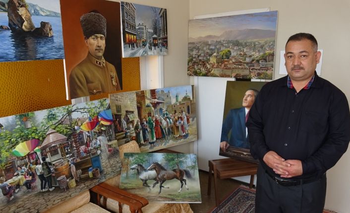 Karabük’te, yaşayan Afganistanlı ressam Najeebullah Mehrzad(51), atölyeye çevirdiği evinin bir odasında yaptığı resimleri sosyal medya üzerinden sergileyip, satıyor.