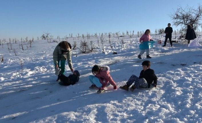 Gaziantep’te çocuklar tepsi, poşet ve leğenlerle kayarak eğlendi