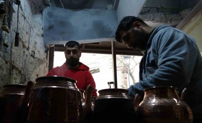 Esnaf ve vatandaşlarca getirilen bakır eşyaları ocaktaki ateşi körükleyerek kalaylayan ustalar, siparişleri yetiştirmek için büyük emek sarf ediyor.