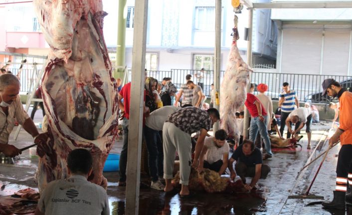Büyükbaş kurbanları çok sayıda kişinin yardımıyla kesen kasapların kurbanları yere yatırmada zorluk yaşaması dikkat çekti. Kurbanları kesilen vatandaşlar etlerini parçalamak için uğraşırken kesilen kurbanların akan kanı kesim alanlarını kana buladı.