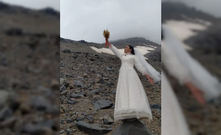 Türkiye’nin çatısı olarak bilinen Ağrı Dağı’na tırmanan Dağcı Sevgül Eraslan, sosyal mesaj vermek amacıyla 4 bin 200 metrede gelinlik giyip sembolik olarak Ağrı Dağı ile evlendi.