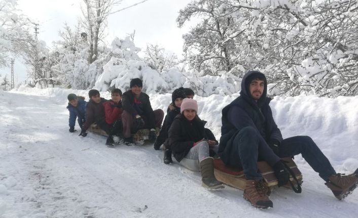 Gevaş’ta kar yağışı hayatı olumsuz etkilerken, ilçeye bağlı Elmalı Mahallesinde bir araya gelen gençler, kendi imkanlarıyla yaptıkları kızaklarla kaymanın keyfini yaşadı. Soğuğa aldırış etmeden yaklaşık iki kilometre yürüyen gençler, Artos Dağı eteklerinden başlayarak evlerinin önüne kadar kayıyorlar. Yaşları 13 ile 25 arasında değişen gençler, hafta sonu tatili olması nedeniyle zamanlarını kızakla kayarak geçirdiklerini dile getirdiler. Kızak keyfinin çocukluktan gelen ve her daim sevilen bir aktivite olduğunu belirten Halil Leyla isimli genç, “Kış aylarının vazgeçilmez eğlencelerinden olan kayak keyfini, kendi imkanımızla yaptığımız kızaklarla çıkarıyoruz. Arkadaşlarla bu keyifli günleri yaşıyoruz. Çocukluğumuzdan beri kızak kaymayı çok severiz. Kızak kaymak, çocuklardan büyüklere kadar herkesin sevdiği aktivitelerden biridir. Kayak merkezlerine gidecek imkanımız olmadığı için bizler de mecburen mahalle yollarında kayıyoruz” dedi.
