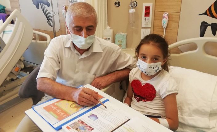 Erzurum Şehir Hastanesinde yanık tedavi merkezinde tedavi gören Havin Aslan (7) ve Amine Demir (9) hastanenin sınıf öğretmeni Halil Elitok nezaretinde eğitimlerinden geri kalmıyorlar.