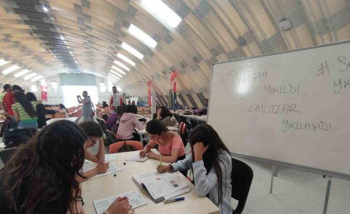 6 Şubat Kahramanmaraş merkezli depremler 11 il içinde en büyük yıkımı Hatay’da meydana getirdi. Binlerce konutun yıkıldığı kentte eğitim kurunmları ve öğrencilerin hayalleri de enkaz altında kaldı. Hatay’ı terketmeyen lise son ve mezun öğrenciler, çadır ve konteyner kentlerde kurulan etüt merkezlerinin yanı sıra Hatay Büyükşehir Belediyesi’nin Expo 2021 yerleşkesi içine kurduğu etüt merkezinde YKS’ye hazırlandı. Sınava 2 gün kala eğitmenler, öğrencilere son bilgileri aktardı ve deneme sınavı ağırlıklı çalışma yapıldı. Öğrencilerin etüt merkezinin içindeki bir tahtaya, ‘Hatay yıkıldı,umutlar yıkılması YKS 2023’ yazısı dikkat çekti.