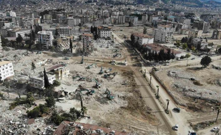 6 Şubat’taki Kahramanmaraş merkezli depremlerin en büyük yıkımı yaptığı Hatay’da, enkaz kaldırma çalışması havadan görüntülendi.