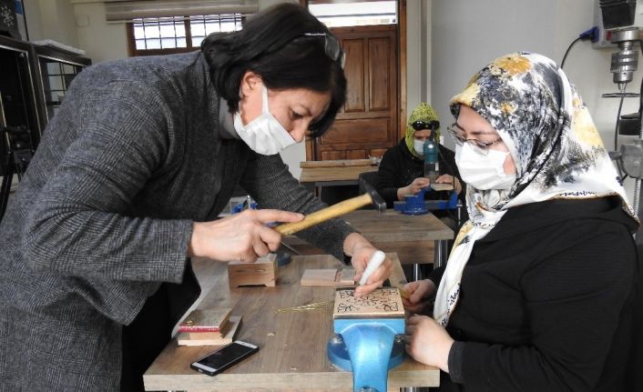 Evde sıkıldığından dolayı el sanatları kursuna geldiğini ifade eden Fatma Kalkan, “Burada ahşaplara şekil veriyoruz. Deniz kabuklarına şekilde veriyorsunuz. Daha sonra onları ahşaplarla birleştiriyoruz. Çok güzel eserler çıkarmaya çalışıyoruz. Buraya hem kendime bir şeyler katayım diye geldim hem de boş zamanlarım değerlensin diye geldim. Daha doğrusu evde sıkılıyoruz. Kendi kendimize yapacak bir şeyler öğrenmek amacıyla geldim. Burada her şeyi unutuyoruz. Bütün sıkıntılarımız gidiyor. Arkadaşlarımızı görüyoruz ve sıkıntılarımızı bir nevi ahşaba döküyoruz” diye konuştu.