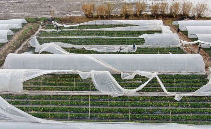 Antalya’da dün yağmur ve hortumun vurduğu çilek seralarında enkaz kaldırma çalışmalarına bu kez de rüzgar engel oldu. Naylonları yırtılmasın diye toplamaya çalışan üretici, şiddetli rüzgar nedeniyle çalışmasını bırakmak zorunda kaldı.