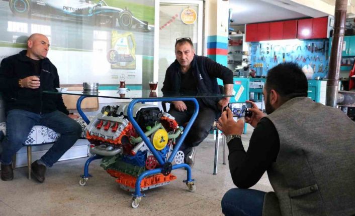 Mekaniker usta Mustafa Yıldızdağ, yaptığı masayı motor üzerine tasarladığından bahsederek, “Uzun zamandır aklımda böyle bir tasarım vardı. İnternet ortamında da böylesi tasarımları görüp takip ediyordum. Elime Audi marka bir aracın 2.4 motoru geçti ve bu motordan yapmayı düşündüm. Motoru bütün parçalarını titizlikle temizleyerek, farklı renklere boyayarak bir görsellik oluşturmak istedim. Motorun içi boştur ama dıştan bire bir araç motorudur. Ben bu masayı komple motor üzerine tasarladım. Üzerindeki çizgilerin mavi oluşu, masanın V şeklinde olması, motorun V motor olmasından dolayı böyle bir tasarım oluşturdum. Güzel olduğunu düşünüyorum, gelen müşteriler de hoş olduğunu söylüyorlar. Bu dükkanın mekaniker bir dükkan olmasına yakışır diye böyle bir masa tasarladım. Küllükleri masa ile eşleşsin diye araç pistonundan yaptım. Karşı duvarda duran saati de araçlarda bulunan fren diski ve balatalarından yaptım. Bu ürünleri tamamen atık malzemelerden ürettim. Masada bulunan demir parçaları ve boruları metre işi aldım ama diğer malzemeler tamamen bizden, motoru da hurdacıdan satın aldım” dedi.