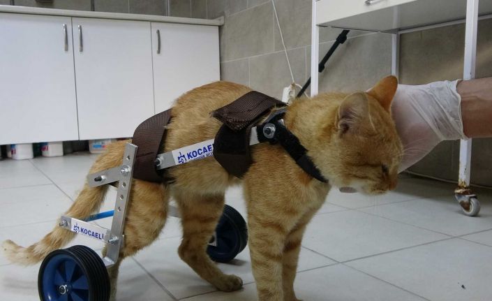 Kocaeli’de arabanın çarpmasıyla arka iki bacağı felç kalan ve yürüyemeyen kediye, özel yürüteç yapıldı. Yeniden hayata tutunan kedi şimdilerde koşuyor.