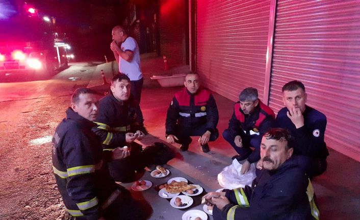 Samsun’da bugün gece saatlerinde Canik Eski Sanayi Sitesi’nde bir iş yerinde yangın çıktı. Vatandaşların haber vermesiyle konu itfaiye ekiplerine intikal etti. Ekipler yangın söndürme araçlarıyla yola çıkarak kısa sürede iş yerine ulaştı. Yangın çok fazla büyümeden önlendi. Soğutma çalışmalarını da tamamlayan ekipler tutacakları oruç için hazırlığa başladı. İtfaiye erleri sabaha az bir vakit kalması nedeniyle sahurunu yangın yerinde yaptı. Ortaya serdikleri yiyecekleri kaldırıma oturarak yediler.