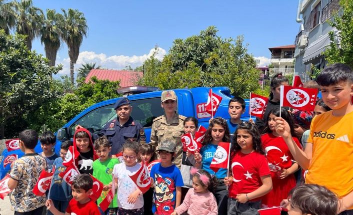 Defne İlçe Jandarma Komutanlığı 23 Nisan Ulusal Egemenlik ve Çocuk Bayramı çerçevesinde depremzede çocuklara yaşadıklarını biraz olsun unutturmak için çocukları ziyaret edip bayramlarını kutladı.