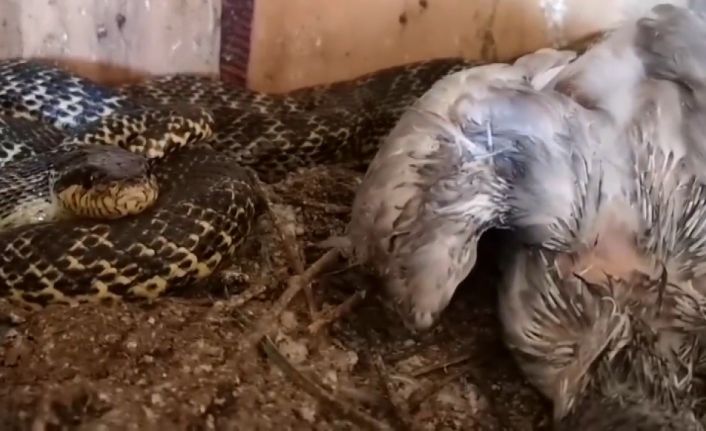 Bursa’da kafese giren bir yılan güvercinleri boğup yemeye çalıştı. Cesur vatandaş, yılanı elleriyle yakalayıp kafesten çıkardı. Nefes kesen ânlar kameralara yansıdı.