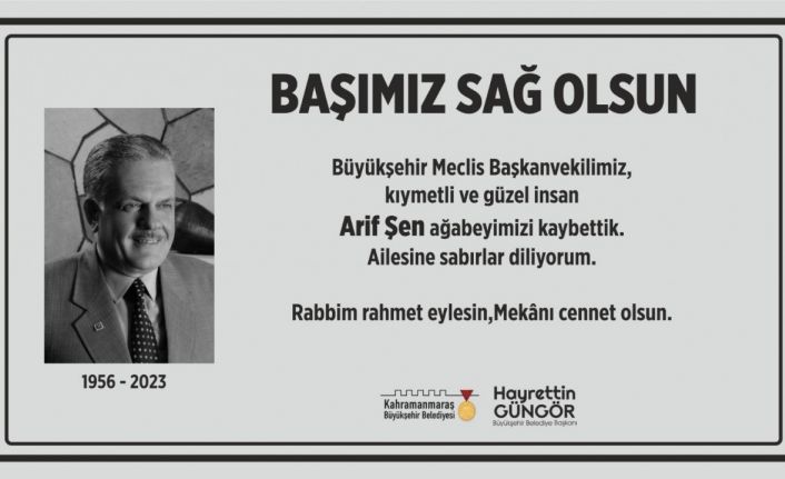 Kahramanmaraş Büyükşehir Belediye Başkanı Hayrettin Güngör, Büyükşehir Belediyesi Meclis Başkanvekili Arif Şen’in vefatı dolayısıyla taziye mesajı yayımladı. Başkan Hayrettin Güngör mesajında, “Büyükşehir Belediyesi Meclis Başkanvekilimiz Arif Şen ağabeyimizi kaybettik. Arif Şen ağabeyimize Allah’tan rahmet, ailesine ve sevenlerine sabrı cemil diliyorum. Rabbim cennetiyle müşerref kılsın. Başımız sağ olsun” ifadelerine yer verdi.