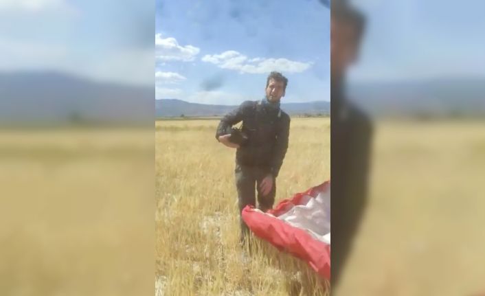 Kanada uyruklu yamaç paraşütçüsü Denizli Çameli Yaylacık Dağı’ndan dün sabah atlayış yaptı. Paraşütçü, yaklaşık 110 kilometre uzaklıktaki Burdur’un Yassıgüme köyünde Kazım Öz’e ait arpa ekili tarlaya acil iniş yaptı. Ekili alanda paraşütçüyü gören Öz ise, ilk başta neye uğradığını şaşırdı ardından paraşütçünün yanına giderek cep telefonuyla sosyal medyadan canlı yayın yapmaya başladı. Burdur şivesiyle konuşan Öz ile az Türkçesi bulunan paraşütçünün diyalogları ise güldürdü.