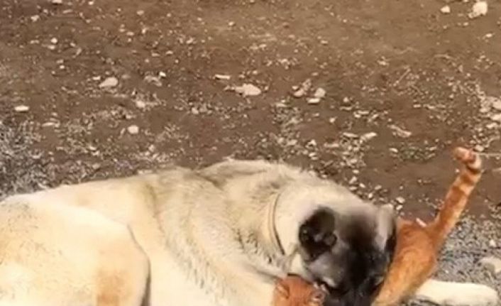 Gümüşhane’nin Kelkit ilçesinde, ‘Kral’ isimli kangal cinsi köpek ile bir sokak kedisinin dostluğu ilgi çekiyor.