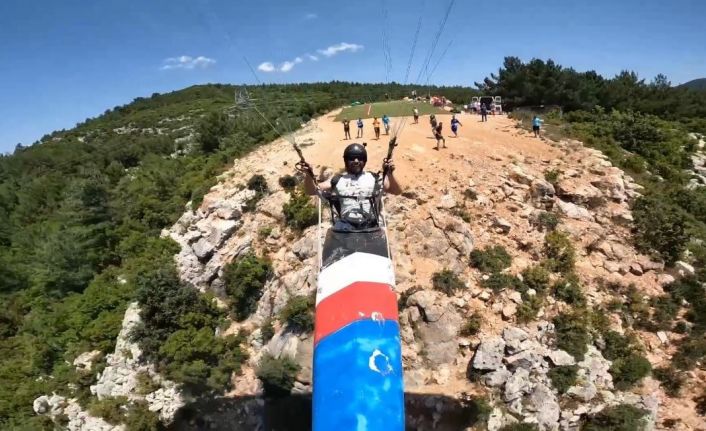 Antalya’nın Alanya ilçesinde yamaç paraşütü pilotu Hasan Kaval, özel olarak hazırladığı düzenek sayesinde paraşütüne bağladığı kano ile denize iniş yaptı.