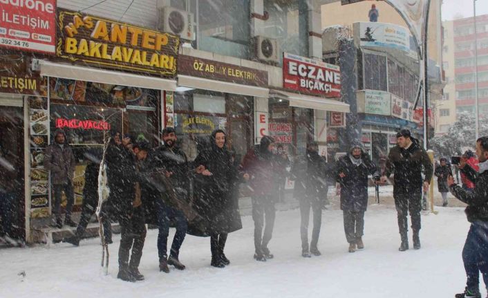 Mardin’in Kızıltepe ilçesinde 2 yıl aradan sonra yağan kar vatandaşlar tarafından sevinçle karşılandı. Kendini dışarı atan gençler kar altında halay çekti.