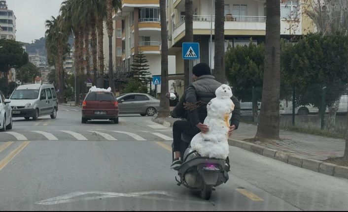 Mersin’in Anamur ilçesi çevresine yağan karı fırsat bilen vatandaşlar o anların keyfini çıkarırken, iki arkadaşın motosikletle kardan adamı taşıması dikkat çekti.