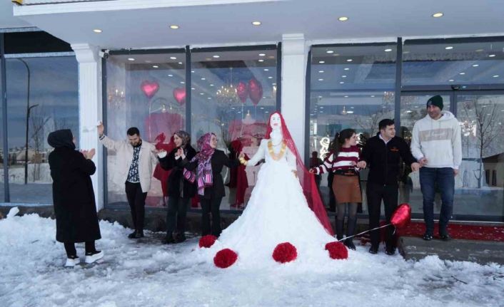 Muş’ta etkili olan kar yağışını eğlenceye dönüştüren kuaför Mukadder Er, ilginç bir etkinliğe imza attı. Kardan adam yapmak yerine bu kez ‘kardan gelin’ yapan Er, gelin süslemelerini bir adım ileriye taşıdı. Kardan geline değeri yaklaşık 1 milyon lira olan altın takan Er ve çalışanları, ilginç görüntüler oluşturdu.