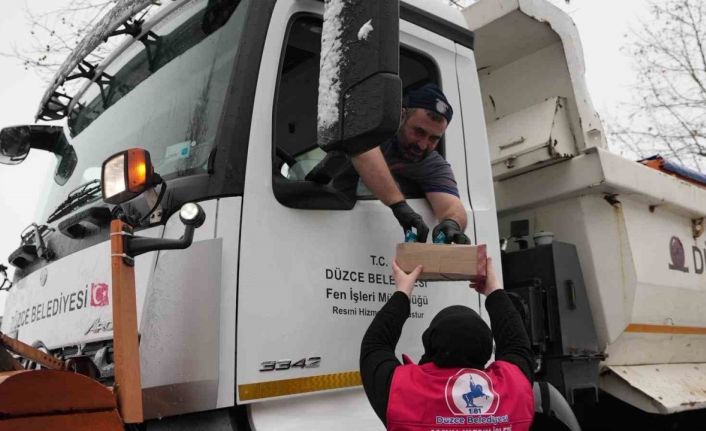 Düzce’de hafta sonundan itibaren yaşanan etkili olan kar yağışında mücadele eden Düzce Belediyesi kar timlerine sıcak çay ve kek ikramı yapıldı.