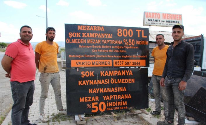 Varto ilçesinde granit ve mermer işletmecisi Bayram Çetinkaya, mezar taşı için ilginç bir kampanyaya imza atmıştı. Ölmeden önce mezar taşını yaptıranlara yüzde 50 indirim uygulayan Çetinkaya, fiyatların 800 liradan başlayıp 100 bin liraya kadar çıktığını söyleyerek, önceki kampanyasına bu seferde yeni bir kampanya ekleyerek kaynanası ölmeden mezar yaptırmak isteyen enişte ve geline yüzde 50 indirim kampanyası gerçekleştirdi.