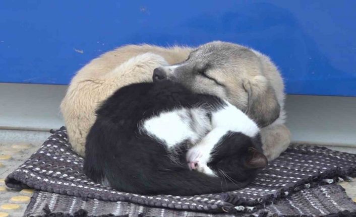 Üşüdükleri için birbirlerine sarılıp uyuyan kedi ve köpeğin bir banka ATM’sinin önünde altlarına konulan paspasların üstündeki anlarını bir vatandaş cep telefonu kamerasıyla görüntüledi. Hava sıcaklığının 2 dereceyi gösterdiği sabah erken saatlerde yürüyüş yaparken karşılaştığı yürekleri ısıtan anları değerlendiren Gökhan Torun, “Bu minik canlara denk geldim. Her ne kadar düşman gibi görünseler de bunların yan yana olması benim içimi öyle bir ısıttı ki, ben havanın soğukluğunu hissedemedim” dedi.