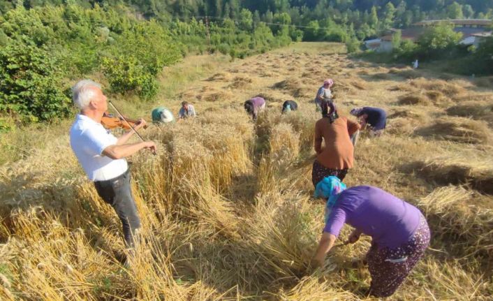 BARTIN (İHA) – Bartın’da köylüler imece usulü hasat yaparken, tarla sahibi emekli müzik öğretmeni de komşularına keman resitali ile Bartın türküleri ve yöresel manileriyle müzik ziyafeti sunuyor.