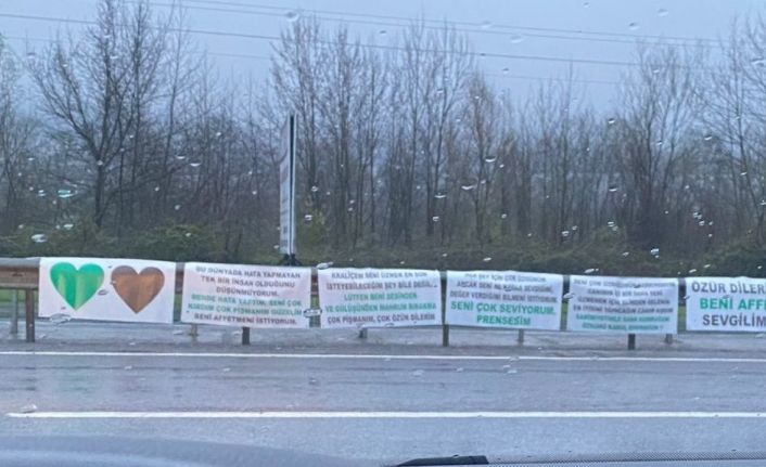 Kocaeli’de kendisini eşine affettirmek isteyen bir vatandaş inanılmaz bir yönteme başvurdu. Kartepe ilçesindeki bir yol kenarını pankartlarla dolduran vatandaş, her bir pankarttaki yazıda eşini çok sevdiğini, hata yaptığını ve af beklediğini yazdı.