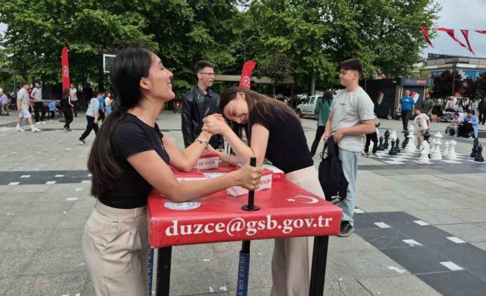 Gençlik haftası etkinlikleri yapılan organizasyonlarla Düzce’de kutlanmaya devam ediyor. Bu çerçevede Anıtpark meydanından Gençlik ve Spor İl Müdürlüğü ile Düzce Belediyesi Gençlik ve Spor Hizmetleri Müdürlüğü antrenörleri ’Spor sokağı’ kurdu. Ayak voleybolundan futbol sahasına, saha satrancından bilek güreşine kadar birçok platform kuran antrenörler buralarda gençlere ve çocuklara spor yapma imkanı sağladı.
