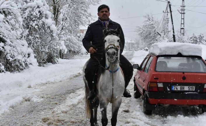 Bartın’da 4 gün boyunca etkili olan kar yağışı sonrası iş adamı Fahri Gürbüz, ulaşımını at ile sağlıyor.