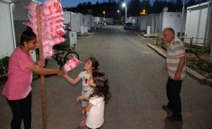 Kahramanmaraş’ta konteyner kentte kalan depremzede Nazife Çayır, her akşam aldığı onlarca pamuk şekeri çocuklara dağıtıyor.