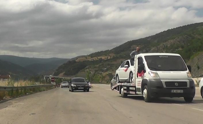 Tokat’ta sünnet düğünü öncesinde düzenlenen konvoyda ilginç görüntüler yaşandı. Özel bir şirket çalışan Uğur Çağlar Çelebi (35), arkadaşlarının konvoyda otomobiline çarpmasından endişe ederek önlem aldı. Kiraladığı çekiciye otomobilini yükleyen Çelebi, konvoya katıldı. Konvoyda çekici üzerindeki otomobili görenler ise şaşkınlığını gizleyemedi.