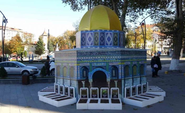 Kütahya’da halkın yoğun olarak kullandığı Zafer Meydanı’na, Sivil Toplum Kuruluşları Platformu (KÜSİDAP) tarafından Kubbetü’s-Sahre maketi inşa edildi. İsrail’in saldırılarına dikkat çekmek için şehit edilen 28 bebeğin isim, yaş ve fotoğraflarının da yer aldığı mezar maketleri konuldu.
