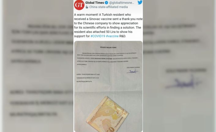 Antalya’da yaşayan mali müşavir Süleyman Yıldırım, Sinovac aşısı olduktan sonra üretici şirkete teşekkür etmek amacıyla mektup yazıp içine koyduğu 50 TL ile Çin’e gönderdi. Yıldırım, Atatürk’ün kartpostallarının da yer aldığı mektubu gönderdiğini belirterek "Amacım jest yapmaktı, kartpostallar daha önemli" dedi.