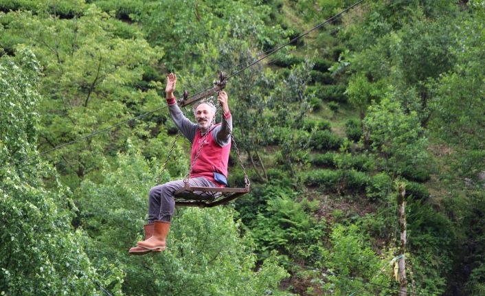 Rize’nin Muradiye Beldesinde 10 yıl önce ev yapımında malzeme taşımak için kullanılan teleferik, şimdi ulaşım aracı oldu.