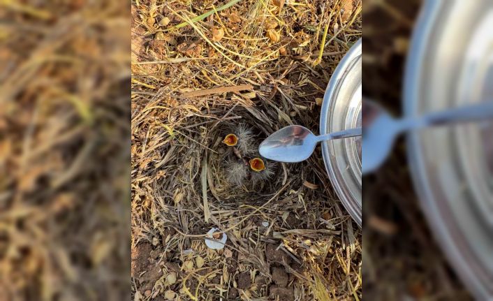 Mardin’de bir çiftçi, tarlada mercimek hasadı sırasında bulduğu yuvadaki kuş yavrularına çay kaşığı ile su verdi.