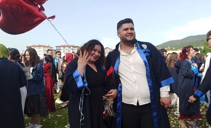 Zonguldak’ın Devrek ilçesinde Bülent Ecevit Üniversitesi’nden mezun olan öğrenciler mezuniyet sevinçlerini keplerini havaya atarak kutladılar. Bir genç ise iki yıldır arkadaşı olan genç kıza evlilik teklifinde bulundu.