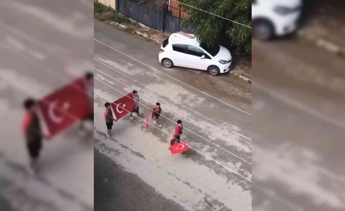 Tokat’ınZile ilçesinde 4 çocuk, 30 Ağustos Zafer Bayramı nedeniyle açtıkları Türk bayrağıyla sokak sokak gezip ’Şehit’ türküsü söyledi. O anlar, cep telefonu kamerasıyla kaydedildi.