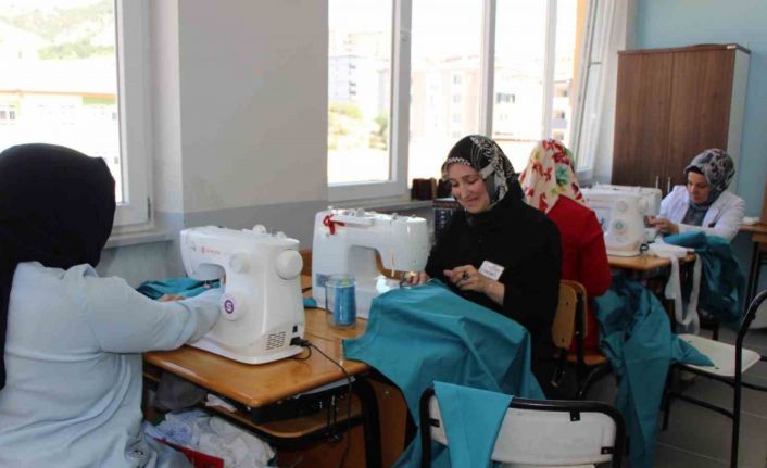 Amasya’da bir grup anne, çocuklarının öğrenim gördüğü okulun ihtiyacı olan yeni perdeleri elleriyle dikip hazırladı.