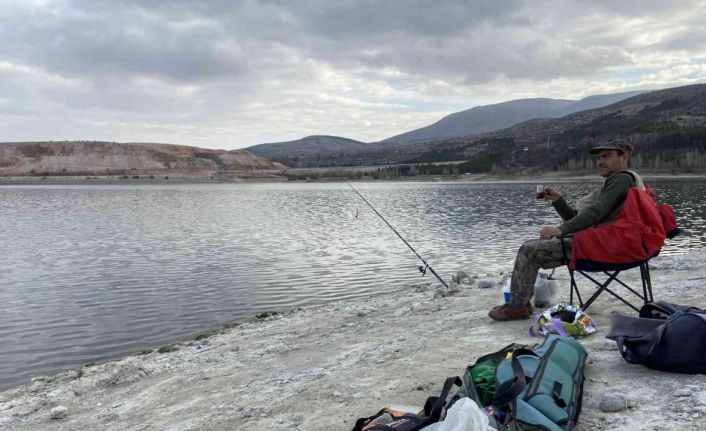 Konya’da Aralık ayı ortası olmasına rağmen yağış olmayan günler yaşanırken, baraj gölünün sularına olta atıp, çay içerek stres atmak isteyenler güneşli havanın tadını çıkarıyor.
