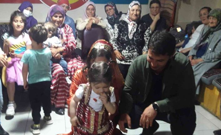 Ardından üzerine şekerleme ve yemişlerin yerleştirildiği yer sofrasının üzerine çıkartılan Eda Bahar’ın iki yağına bağlanan ipin, dedesi tarafından kesilmesinin ardından sofradaki yemişler misafirlere ikram edildi.