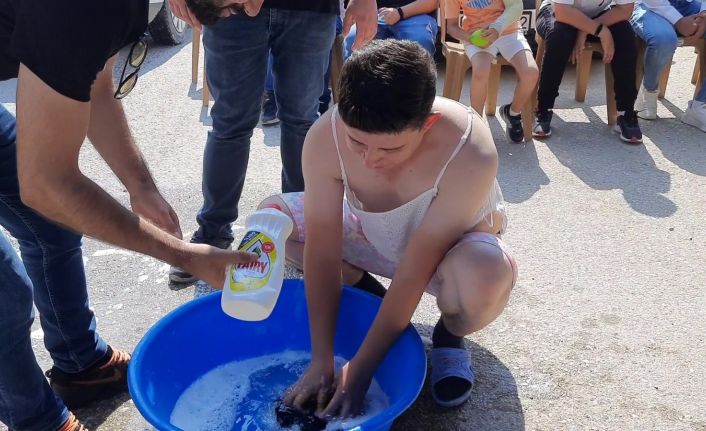 Bursa’da bir düğünde damada arkadaşları tayt giydirip çamaşır yıkattı. Kadın atletiyle oynatılan damadın göbeğine ise rujla gelinin adı yazıldı. O anlar kameralara anbean yansıdı.