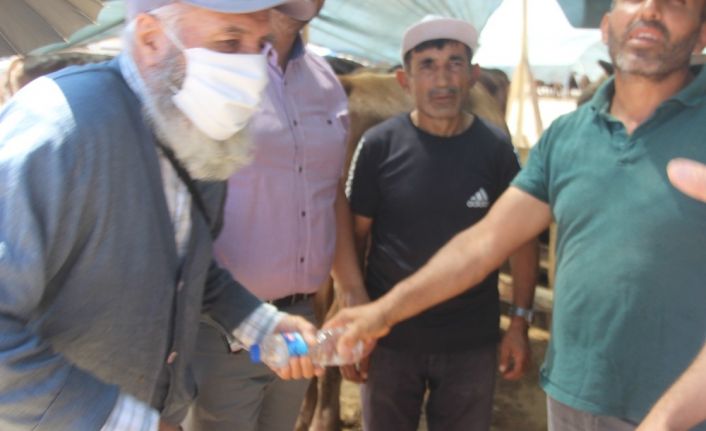 Kurban Bayramı’nın yaklaşması ile birlikte, Kayseri’de besiciler de pazarlarda çadırlarını kurmaya başladı. Pandemi dönemi olması sebebiyle sosyal mesafeli pazarlık yöntemlerine bir yenisi daha eklendi. Kurban almak isteyen müşteri ile pazarlık ederken sosyal mesafe için değnek bulamayan 15 senelik besici Ekrem Parlak, elindeki su şişesinin iki ucundan tutarak pazarlık yaptı.