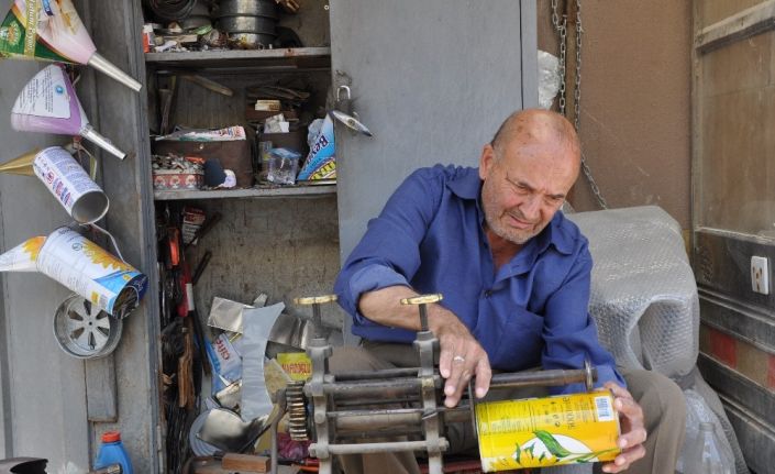 Sandıklı’da atık malzemeleri değerlendirerek çeşitli ürünler ortaya çıkaran Erol Özcü, tenekecilik mesleğinin son temsilcisi olarak çalışıyor.