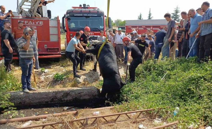 Düzce’de hayvan pazarına satmak için getirdiği hayvanı rögar çukura düştü. Hayvanı boğulmasın diye mücadele ederken elleri yaralandı. İtfaiye ekiplerinin kurtarma çalışmasını vatandaşlar film izler gibi izledi.