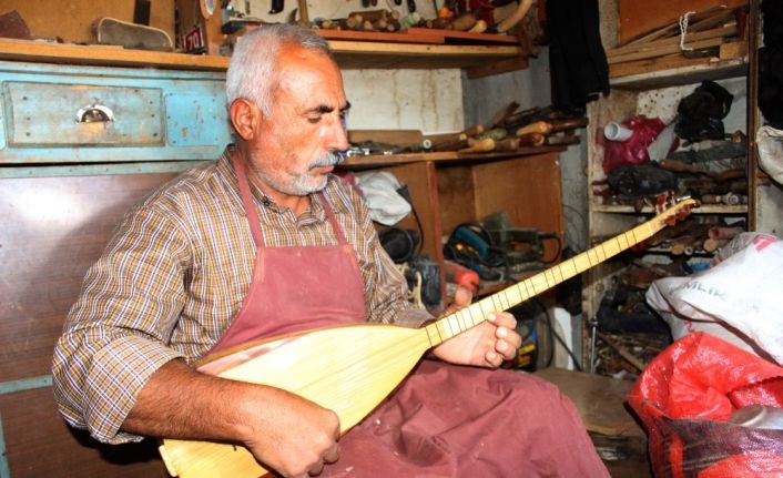 Adıyaman’da 7 yaşından beri saz yapıp çalan Hüseyin İsot, 4 metrekarelik atölyesinde teknolojinin imkanlarından faydalanmadan odunlara şekil verip saz yapıyor.