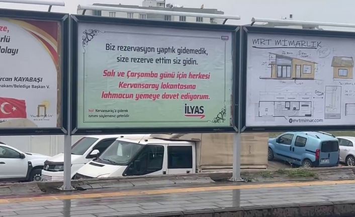 Mardin’in Nusaybin ilçesinde sevdiği kadından ayrılan İlyas adında bir vatandaş, sevgilisinin en çok sevdiği yemeklerden lahmacunu 115 bin 586 nüfuslu ilçeye ısmarlayacağını billboardlara yapıştırdığı afişlerle duyurdu.